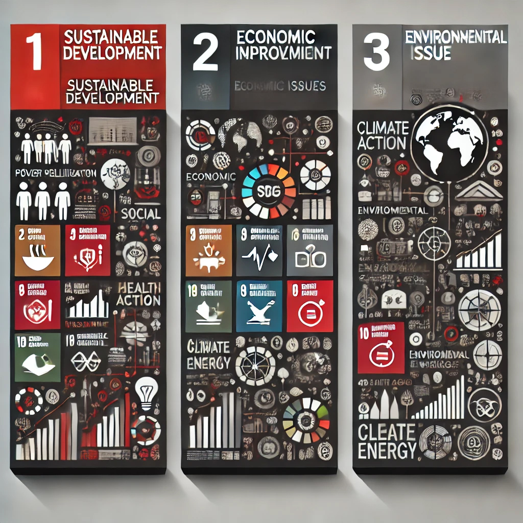 SDGsの目標は「社会問題」「経済問題」「環境問題」の3つに分かれ、それぞれが相互に関連しています。